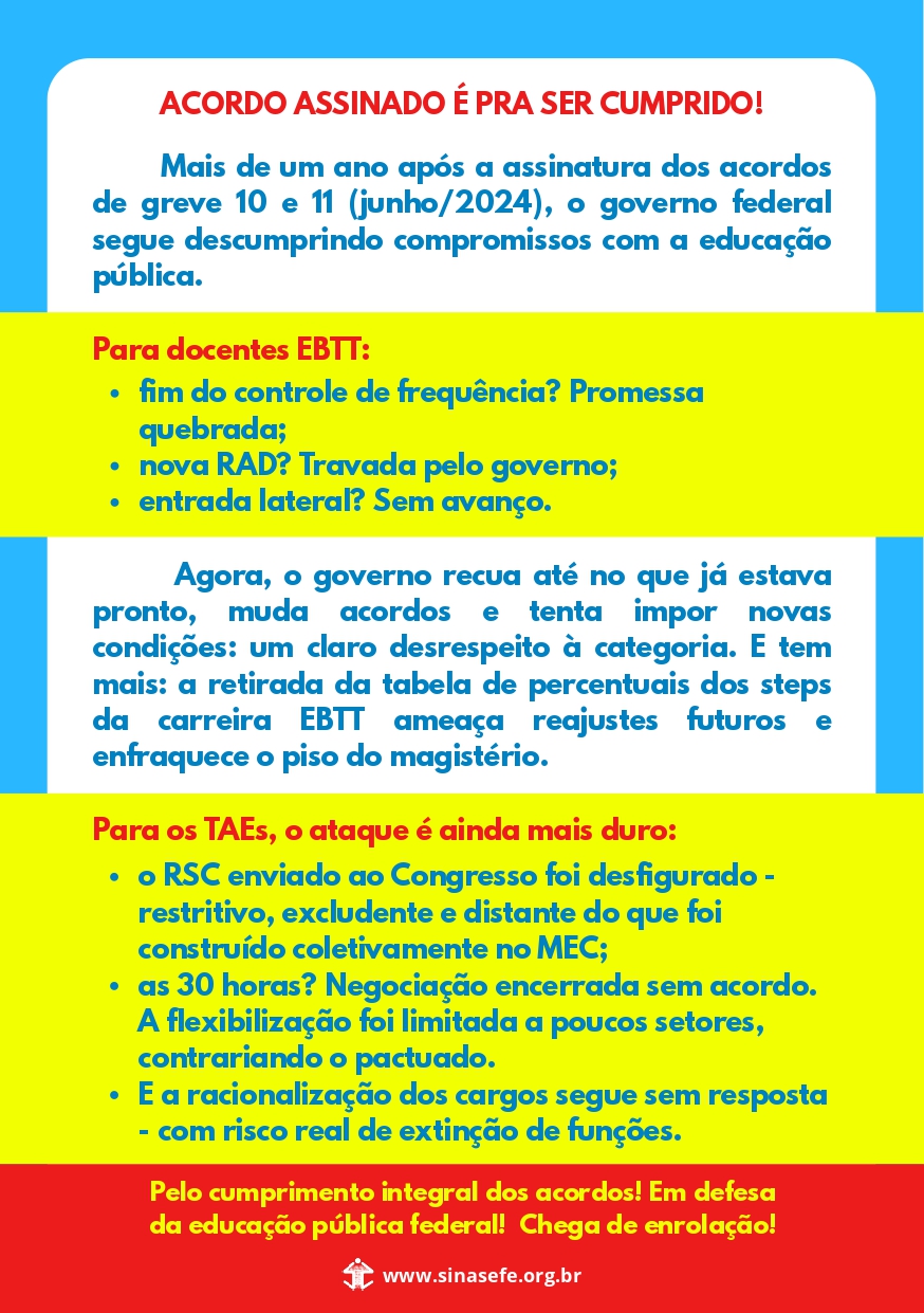 A pauta da luta em 1º de abril será a cobrança intransigente, em todas as bases, pelo imediato cumprimento dos Termos de Acordo nº 10/2024 (para docentes) e nº 11/2024 (para técnico-administrativos), assinados na suspensão da nossa última greve.