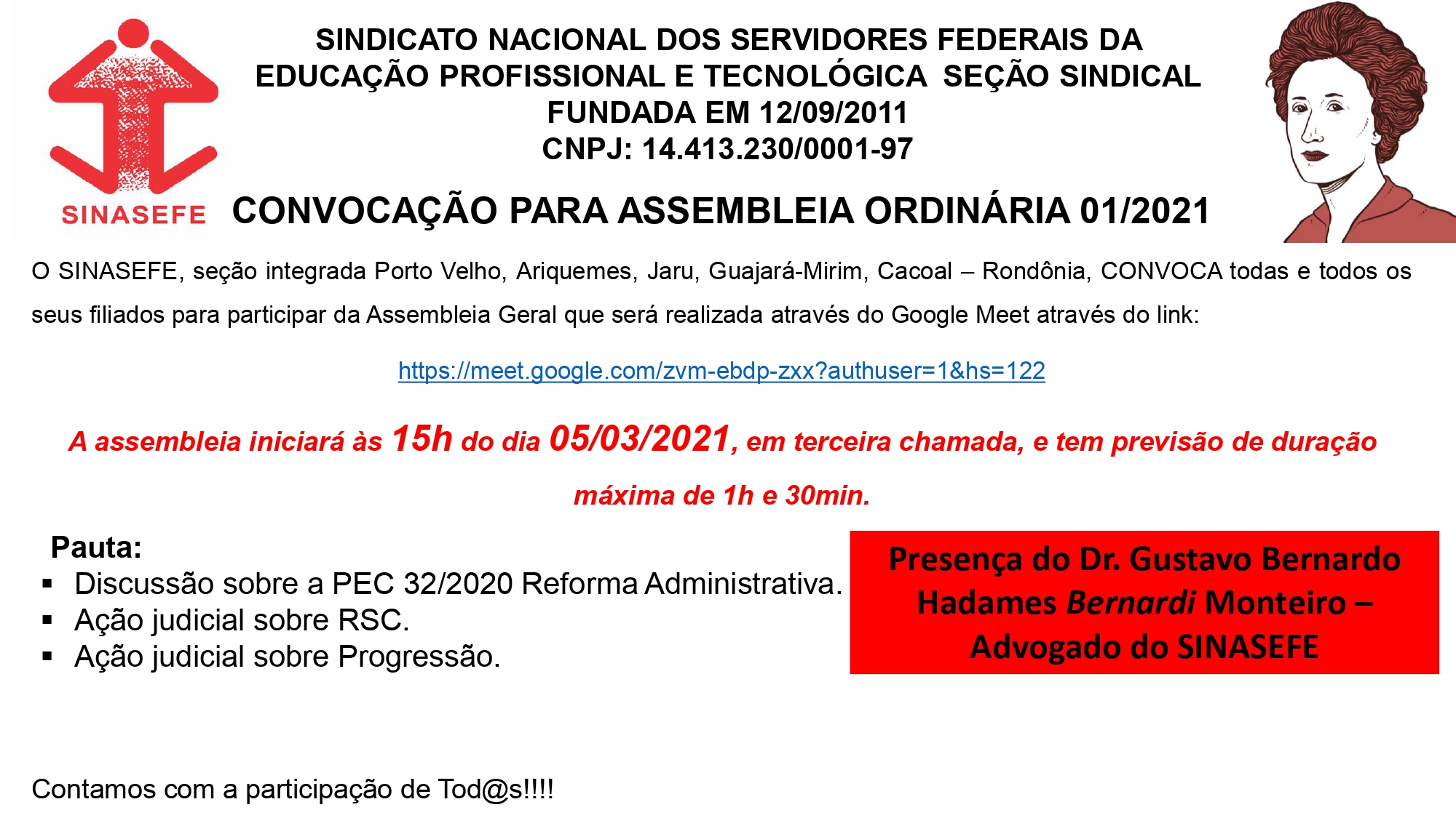 O SINASEFE, seção integrada Porto Velho, Ariquemes, Jaru, Guajará-Mirim, Cacoal –Rondônia, CONVOCA todas e todos os seus filiados para participar da Assembleia Geral que será realizada através do Google Meet através do link: https://meet.google.com/zvm-ebdp-zxx?authuser=1&hs=122