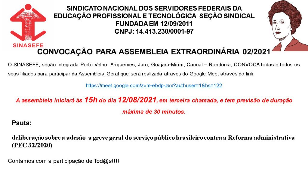 Convocação para assembleia extraordinária 02/2021. O SINASEFE, seção integrada Porto Velho, Ariquemes, Jaru, Guajará-Mirim, Cacoal – Rondônia, CONVOCA todas e todos os seus filiados para participar da Assembleia Geral que será realizada através do Google Meet através do link: https://meet.google.com/zvm-ebdp-zxx?authuser=1&hs=122