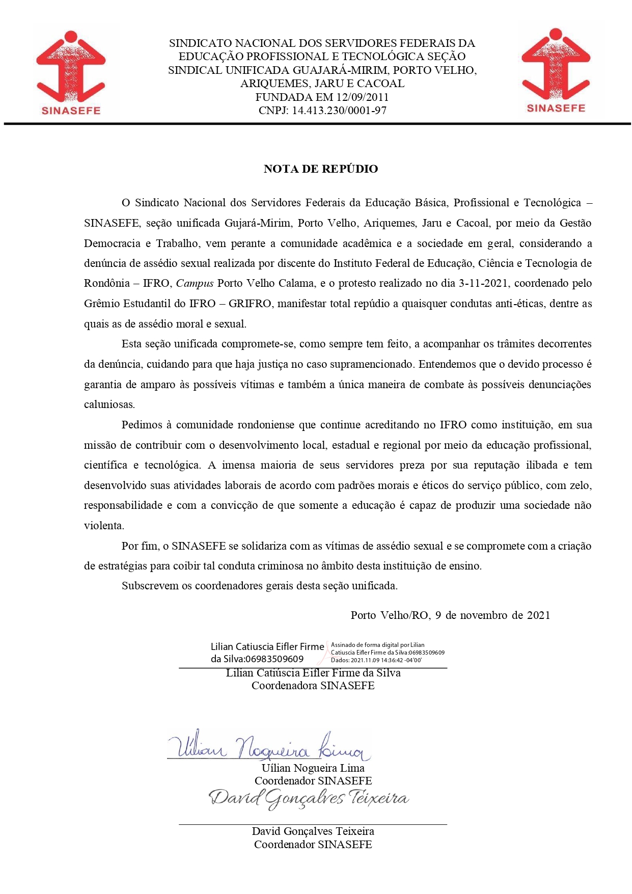 O Sindicato Nacional dos Servidores Federais da Educação Básica, Profissional e Tecnológica –SINASEFE, seção unificada Gujará-Mirim, Porto Velho, Ariquemes, Jaru e Cacoal, por meio da Gestão Democracia e Trabalho vem perante a comunidade acadêmica e a sociedade em geral, considerando a denúncia de assédio sexual..