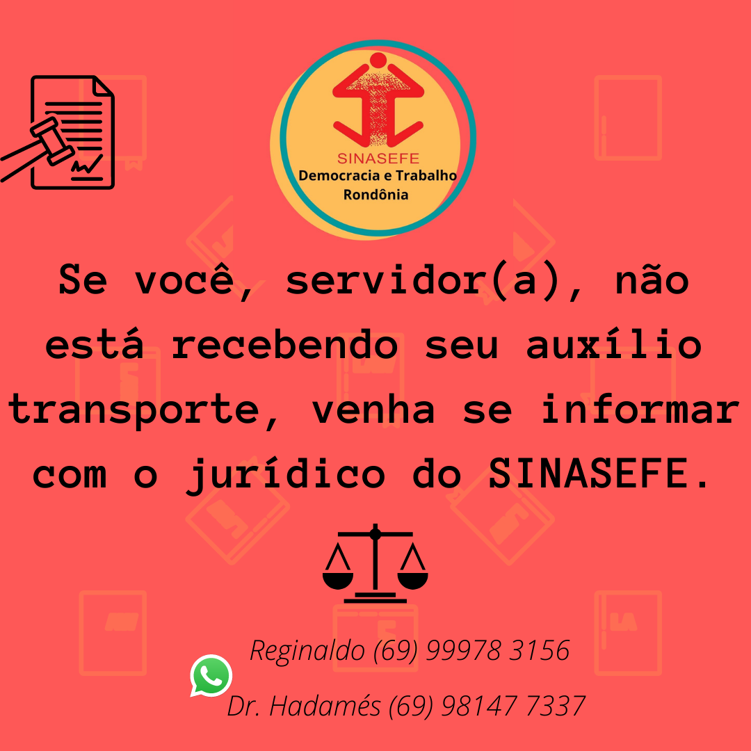 Com as melhores saudações, o SINASEFE, seção integrada Porto Velho, Ariquemes, Jaru, Guajará-Mirim, Cacoal – Rondônia, INFORMA seus filiad@s sobre as ações da pasta de assuntos legislativos e jurídicos: Se você, servidor (a), não está recebendo seu auxílio transporte, venha se informar com o jurídico do SINASEFE….